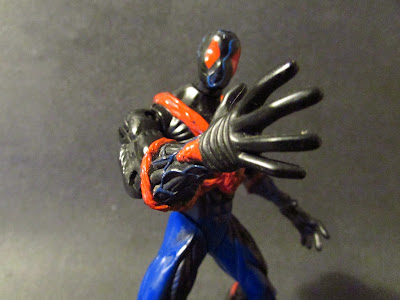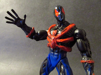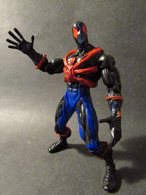 A figura propriamente dita, ou seja o Spider-Man sem a armadura estranha, aparenta ter um uniforme tipo simbionte mas que não faz parte de nenhuma história conhecida da personagem Marvel.