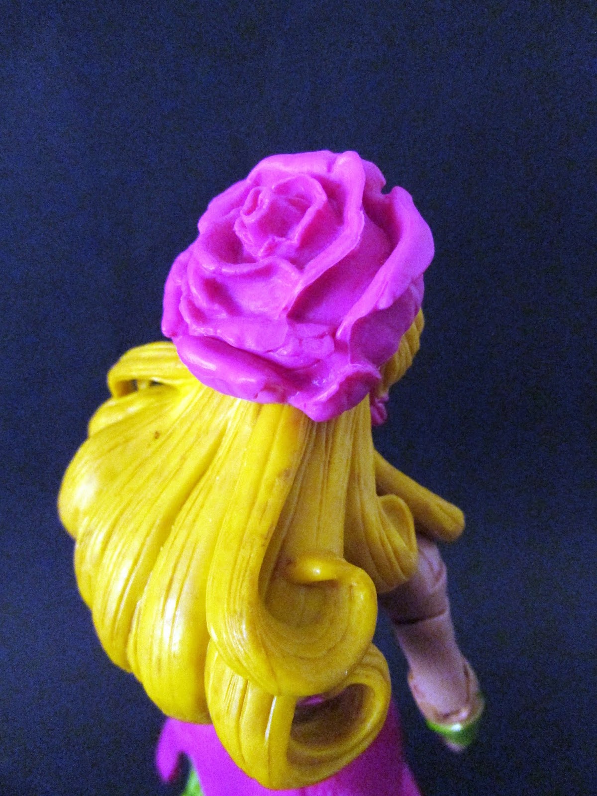 Compreendo que esta seja uma tentativa para replicar a rosa que a figura vintage tinha nas contas, mas não existe qualquer solução para prender este acessório às costas. Depois, como a rosa é em plástico sólido é tão pesado que é quase impossível manter esta arma nas mãos delicadas da figura.