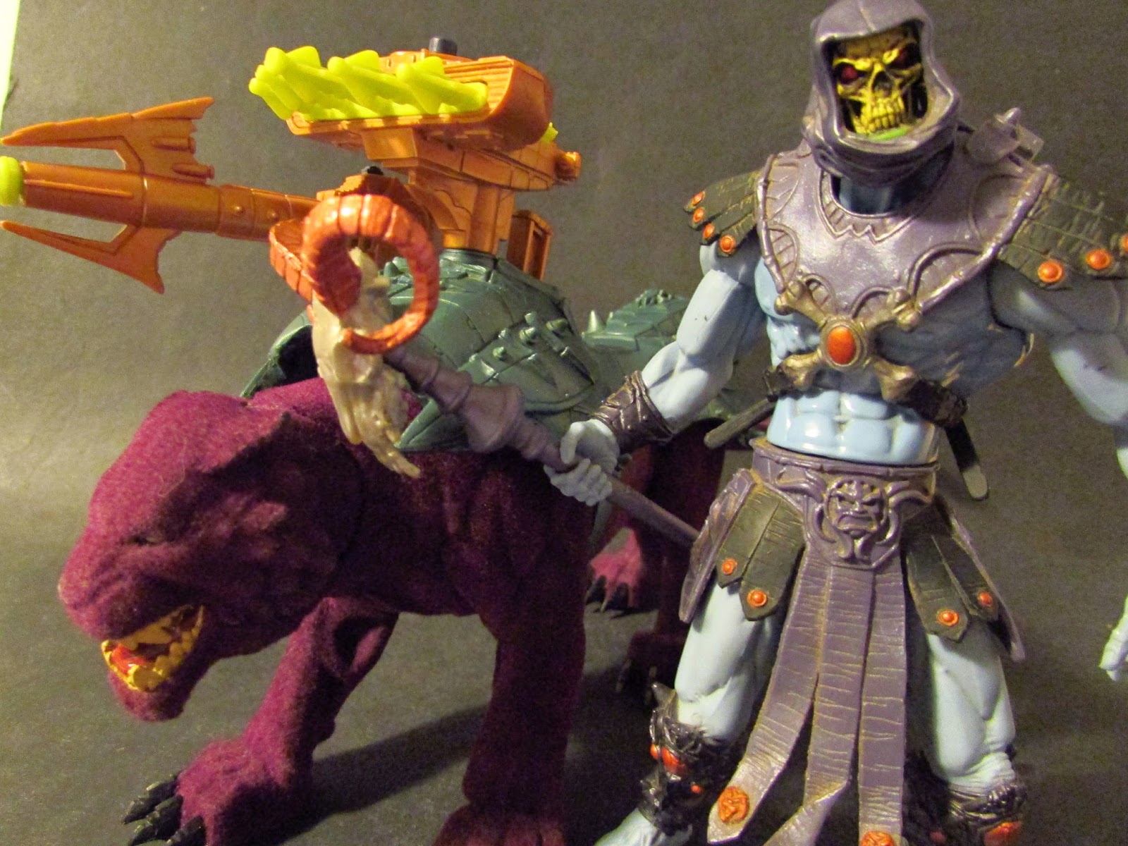 A figura aparece enorme, com uma sela tecnológica e armas montadas no seu arnês, que vão ajudar o seu amo Skeletor nas suas conquistas por Eternia.