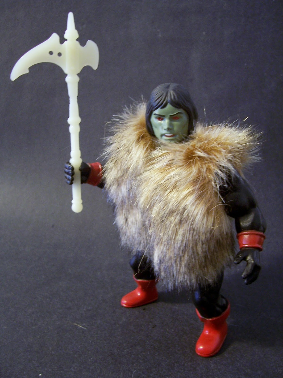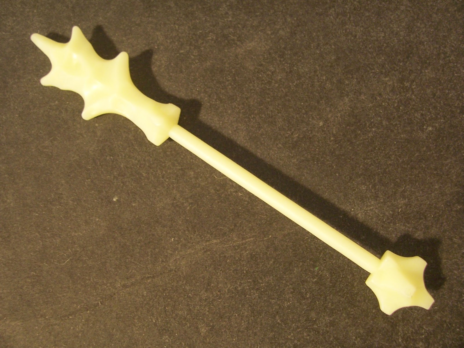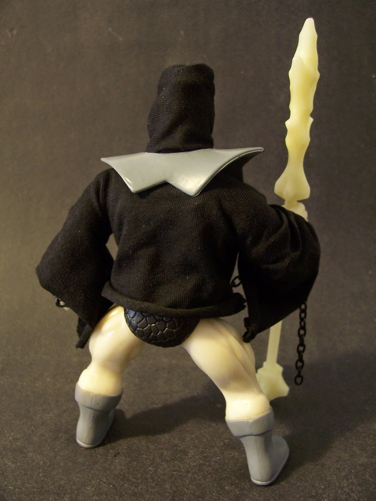 A sua arma, o lendário Staff of Pain é feito também de material que brilha no escuro e pode ser usado por qualquer uma das figuras da linha.